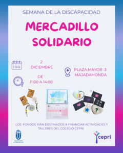 El próximo martes 2 de diciembre, con motivo del Día Internacional de las Personas con Discapacidad, se celebrará un Mercadillo benéfico en la Calle Gran Vía de Majadahonda. En este